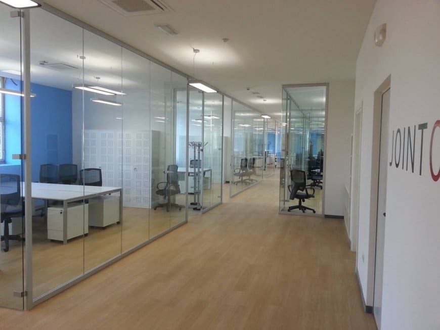 Progetta, realizza, e installa pareti mobili interamente su misura in truciolare nobilitato e vetro per uffici, aziende e capannoni.